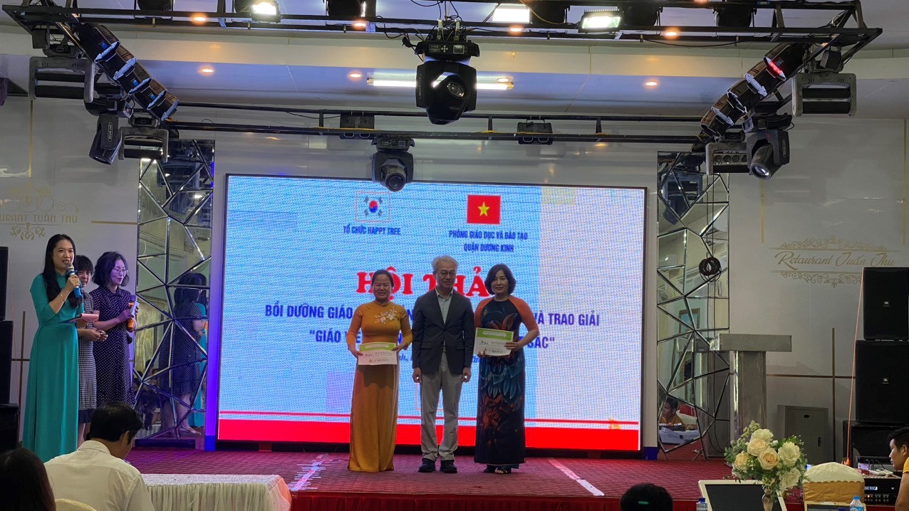 Ông Song Huyng Rok, đồng chí Nguyễn Minh Phương trao giải cho giáo viên Trường Tiểu học Hải Thành