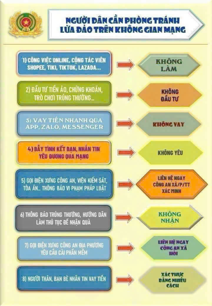Người dân cần nâng cao cảnh giác, không cung cấp thông tin cá nhân, mã OTP, tài khoản ngân hàng cho bất kỳ ai qua điện thoại, tin nhắn hay đường link lạ. Hãy kiểm tra kỹ thông tin, liên hệ cơ quan chức năng khi phát hiện dấu hiệu bất thường.