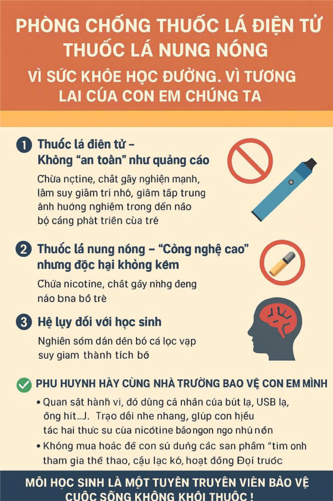 1. Thuốc lá điện tử – Không “an toàn” như quảng cáo: Chứa nicotine, chất gây nghiện mạnh, làm suy giảm trí nhớ, giảm tập trung, ảnh hưởng nghiêm trọng đến não bộ đang phát triển của trẻ. Khói hơi của thuốc lá điện tử có chứa nhiều hóa chất độc hại, kim loại nặng, có nguy cơ gây viêm phổi cấp, tổn thương phổi không hồi phục. Thiết bị nhỏ gọn, mùi thơm dễ che giấu khiến học sinh dễ bị lôi kéo sử dụng trong nhà vệ sinh, lớp học.