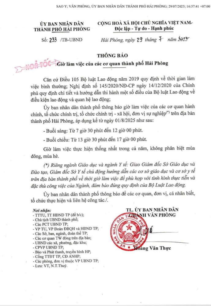 Từ ngày 01/8/2025, các cơ quan hành chính, đơn vị sự nghiệp trên địa bàn thành phố sẽ áp dụng giờ làm việc mới như sau: