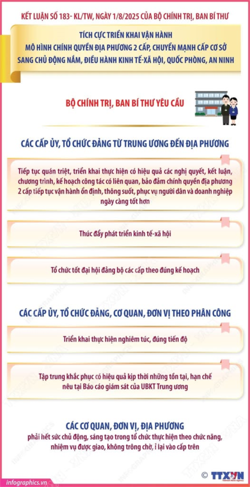 Bộ Chính trị, Ban Bí thư yêu cầu các cấp ủy, tổ chức đảng từ Trung ương đến địa phương tiếp tục quán triệt, triển khai thực hiện có hiệu quả các nghị quyết, kết luận, chương trình, kế hoạch công tác có liên quan, bảo đảm chính quyền địa phương 2 cấp tiếp tục vận hành ổn định, thông suốt, phục vụ người dân và doanh nghiệp ngày càng tốt hơn; đồng thời, thúc đẩy phát triển kinh tế-xã hội, tổ chức tốt đại hội đảng bộ các cấp theo đúng kế hoạch.